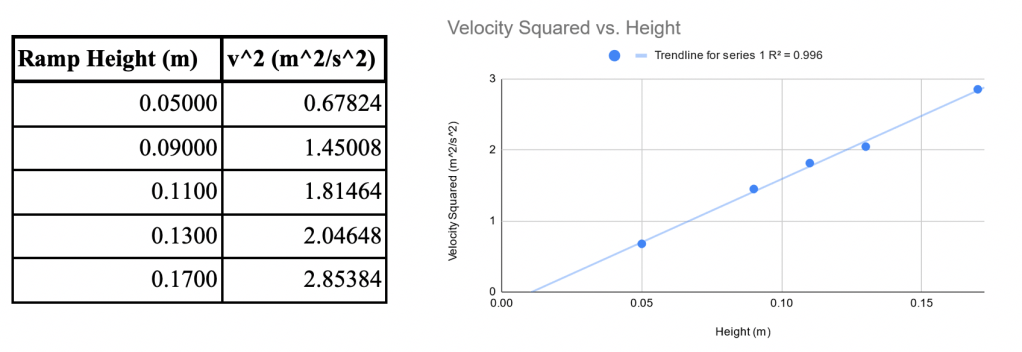 Before we begin the lab we need to have a discussion about reducing error. We have a major problem. Height is easy enough to measure with little uncertainty, but we are looking at an expression with final velocity SQUARED. This is problematic for several reasons. First, the square means that uncertainty is going to propagate and blow up. Second, we’re looking for FINAL velocity. Cherry-picking that data point is sure to be messy with tons of uncertainty and, frankly, a waste of our tools. So what IS consistent and reliable no matter what we do? Students quickly realize it’s acceleration! We know how to best collect that data from other labs: run a regression through the position or velocity graph. We can then use a spreadsheet to manually calculate the expected final velocity for a specified distance.