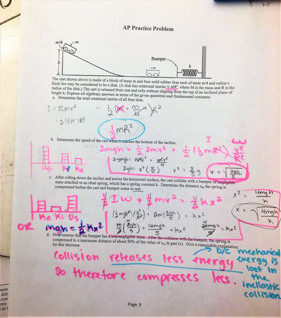 My students were given an AP problem to work on over the weekend. When they arrived in class today I informed them we were going to discuss the problem but don’t pull it out! I proceeded to give students a blank copy of the problem. Students had 10 minutes to complete the problem using only their brains.