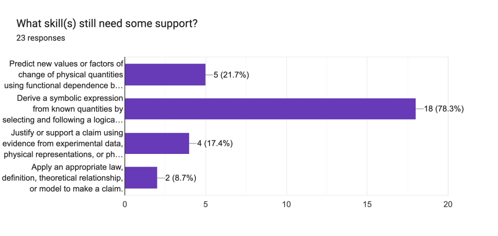 Asking students where they struggle is always telling regarding their thought processes. Currently many of my students are still stuck in a very algorithmic way of thinking/approaching physics rather than working big picture down and it remains telling in their responses. This is still really valuable information because in order to get students where I need them to be I need to meet them were they are at first.
