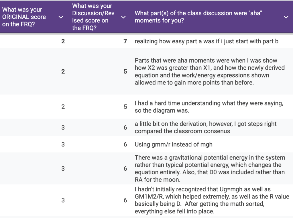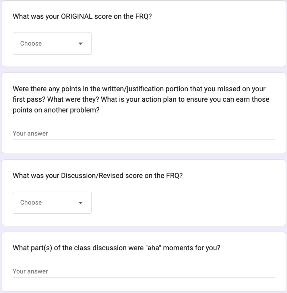 Part of this spawned from the fact that we had -30 windchills last Friday and a remote learning day. With remote learning obtaining student feedback is more critical than ever for me, but I realized this would be a good strategy to maintain for all FRQ practice.