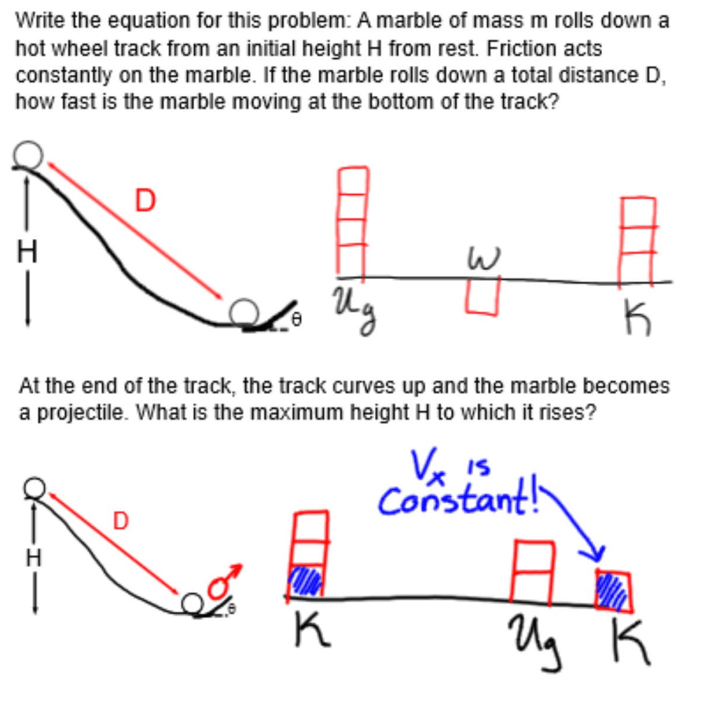 Students are first asked to create the bar charts because there’s no point in trying to write equations and solve for anything until the bar chart is correct. In the first part most students will neglect to include friction. In the second, students will say the ball only has potential energy at the peak, forgetting that the horizontal component stays constant!