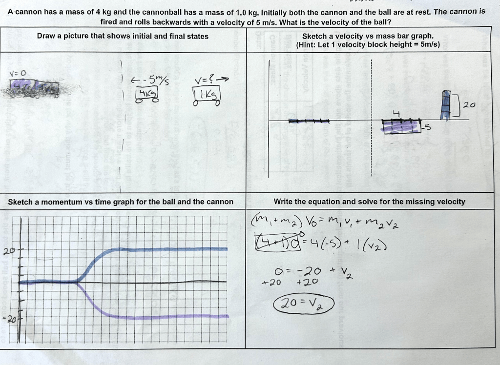 Next, I gave them the scenario where the cannon had a mass of 4.0 kg, the ball had a mass of 1.0 kg and the cannon’s launch velocity was 5 m/s. These numbers were strategically chosen. I wanted to keep whole numbers and also have a cannon-ball ratio that was similar to the actual cannon-tennis ball.